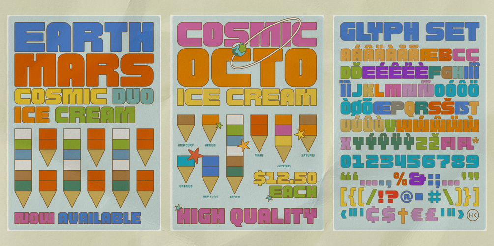 Cosmic Octo is a geometric display typeface for headlines, posters and logos.